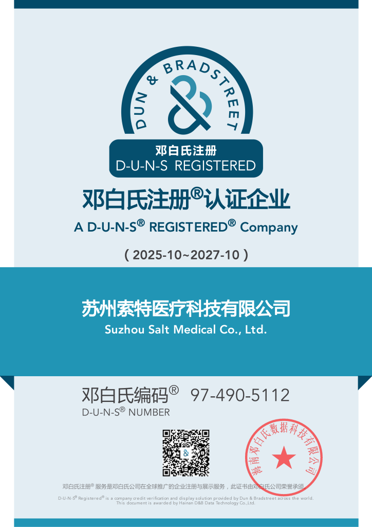 近日,苏州索特医疗科技有限公司(Salt Medical)正式通过全球商业信息服务领域领导者邓白氏公司(Dun & Bradstreet)的严格审核,成功获得邓白氏注册认证,并取得全球通用的邓白氏编码(D-U-N-S® Number)。
